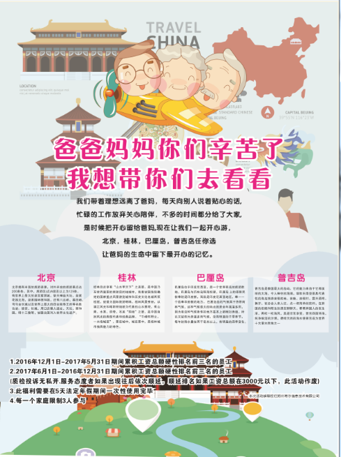 爸(bà)爸(bà)媽(mā)媽(mā)你(nǐ)們辛苦了我想帶你(nǐ)們去看看 我們帶著(zhe)理(lǐ)想遠離(lí)了爸(bà)媽(mā),每天向别人(rén)說著(zhe)貼心的(de)話(huà), 忙碌的(de)工(gōng)作放(fàng)棄關心陪伴,不多的(de)時間都(dōu)分(fēn)給了大(dà)家, 是時候把開(kāi)心留給爸(bà)媽(mā),現在讓我們一起開(kāi)心遊, 北京,桂林,巴厘島,普吉島任你(nǐ)選, 讓爸(bà)媽(mā)的(de)生命中留下最開(kāi)心的(de)記憶。
